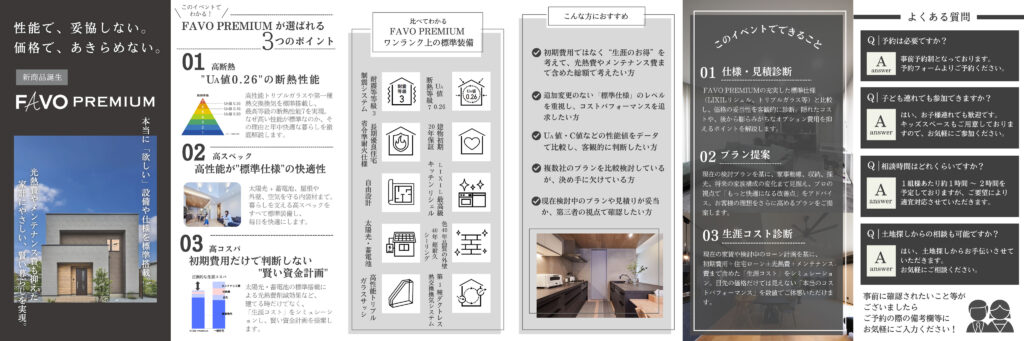 ウッドホームでは、このFavo Premiumの魅力を詳しく解説する相談会を開催中です。 「自分の希望プランだと、普通に建てるのとPremium、どっちがお得?」 そんなシミュレーションもその場で可能です。
